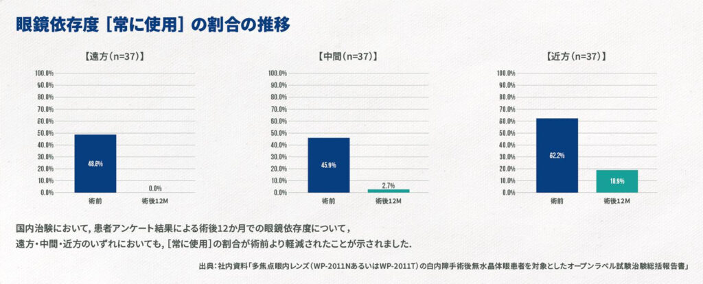 遠方(5m)~中間(80㎝)~近方(40㎝)の視力の改善が期待できます。眼鏡依存度を軽減し、日常の様々な活動に必要なシームレスな視覚を提供するよう設計されています。